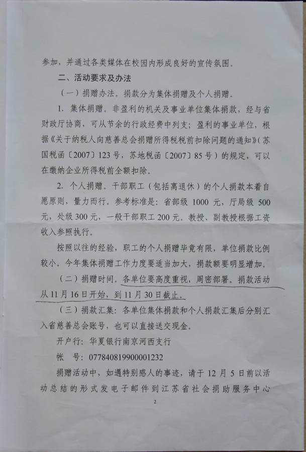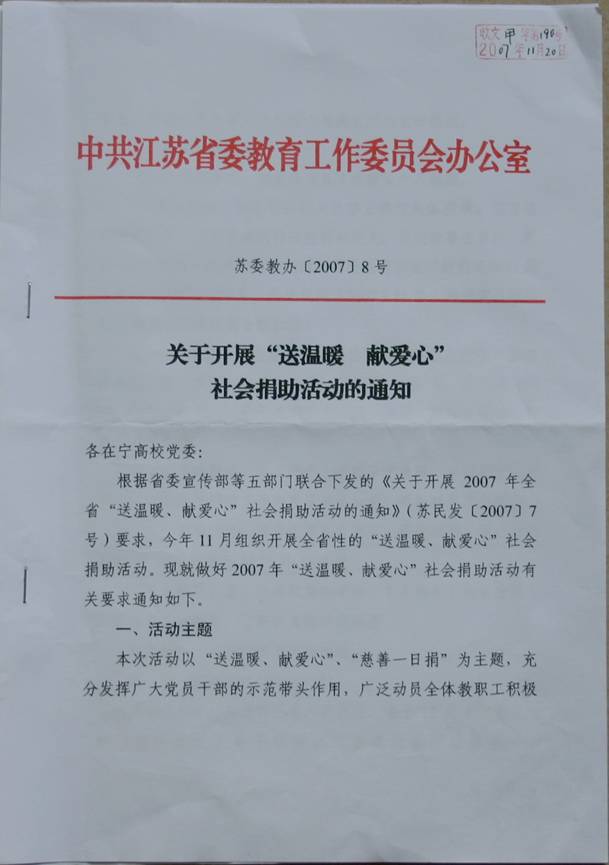 為響應(yīng)省委教育工委關(guān)于開(kāi)展“送溫暖,獻(xiàn)愛(ài)心”社會(huì)捐助活動(dòng)的號(hào)召,決定在全院開(kāi)展慈善捐贈(zèng)活動(dòng)。請(qǐng)各部門(mén)按照通知(見(jiàn)附件)的要求,認(rèn)真做好慈善捐贈(zèng)的宣傳發(fā)動(dòng)和捐贈(zèng)登記工作,12月5日上午11時(shí)前將捐贈(zèng)登記表、捐款交學(xué)院組織宣傳部孟慶云(明德樓407室)。