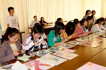 5月14日下午,有“金陵神剪張”之稱的民俗藝術(shù)家張方林先生在明德樓103報(bào)告廳為學(xué)院廣大剪紙藝術(shù)愛好者作了南京剪紙藝術(shù)講座。張先生講解了剪紙的文化和技巧,并當(dāng)場(chǎng)為同學(xué)們展示了自己的創(chuàng)作過程,同學(xué)們則紛紛拿起剪刀和紙跟著張先生學(xué)習(xí)剪紙。一張張紅紙?jiān)谕瑢W(xué)們獨(dú)具匠心的創(chuàng)作下,變成漂亮的菊花、牽?;ǎ蜩蛉缟耐米映蕴}卜、喜鵲上枝頭,活潑的老鼠,展翅的蝴蝶,各式各樣的紅喜字等,在座觀眾無不嘆為觀止,紛紛報(bào)以熱烈的掌聲。