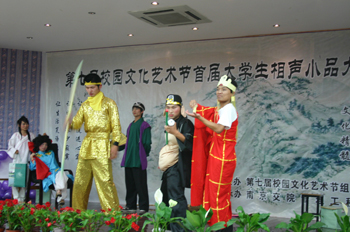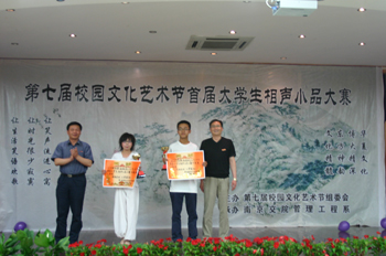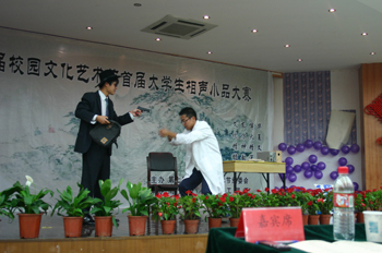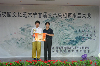 6月2日晚,學(xué)院首屆大學(xué)生相聲小品大賽在明德樓報告廳熱烈舉行。院黨委書記孟祥林、副書記許正林,副院長高進軍及學(xué)院第七屆校園文化藝術(shù)節(jié)組委會部分成員出席并觀看了比賽。 參賽節(jié)目多數(shù)為學(xué)生原創(chuàng)作品,生活素材豐富,表演詼諧幽默、妙趣橫生。表演者以大學(xué)生特有的視角詮釋了相聲小品這一傳統(tǒng)藝術(shù)的文化魅力。最終,信息工程系的相聲《笑談奧運》、管理工程系的小品《理發(fā)》及公路工程系的小品《追憶大學(xué)生活》等節(jié)目分別榮獲一、二、三等獎。