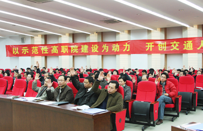 院長賈俐俐在會上作了《提升內(nèi)涵 科學(xué)發(fā)展 全面推進(jìn)示范性高職院校建設(shè)》工作報告。報告全面總結(jié)回顧了2008年行政工作,并從示范性高職院校建設(shè)、教育思想轉(zhuǎn)變、師資隊伍建設(shè)、學(xué)生綜合素質(zhì)拓展、招生就業(yè)工作、科教研和社會服務(wù)工作、繼續(xù)教育與合作辦學(xué)、校園建設(shè)、科學(xué)管理等九個方面對2009年行政工作作了詳細(xì)部署。