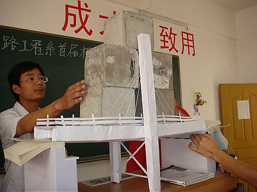 獲得本次競賽一等獎的是07232班周浩等同學創(chuàng)作的“友誼大橋”及07214班林建勇等同學創(chuàng)作的“長江一號橋”,其中“友誼大橋”以自重0.66kg,最大承載力51kg兼獲最優(yōu)承載力獎。此次競賽的橋梁的制作材料僅為普通A4復印紙及膠水、裝訂線,要求各隊選手在最少材料下取得最佳承載效果。