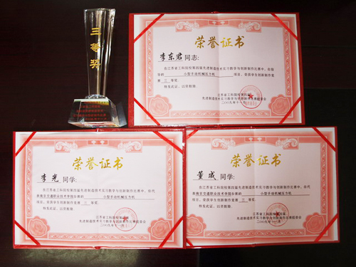 近日,江蘇省工科院校第四屆先進(jìn)制造技術(shù)實(shí)習(xí)教學(xué)與創(chuàng)新制作比賽組委會傳來喜訊:首次參賽的學(xué)院機(jī)電工程系李光和董成兩位同學(xué)設(shè)計(jì)制作的“小型手動(dòng)機(jī)械壓力機(jī)”獲得學(xué)生創(chuàng)新制作競賽三等獎(jiǎng),指導(dǎo)老師李東君獲得學(xué)生創(chuàng)新制作競賽優(yōu)秀指導(dǎo)教師獎(jiǎng)。