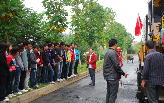 施工隊(duì)負(fù)責(zé)人向同學(xué)們現(xiàn)場(chǎng)介紹了校園內(nèi)瀝青路面攤鋪的相關(guān)情況。老師們進(jìn)行現(xiàn)場(chǎng)教學(xué),對(duì)照現(xiàn)場(chǎng)施工組織和機(jī)械設(shè)備向?qū)W生詳細(xì)介紹了路面攤鋪的施工工藝和碾壓成型的全過(guò)程,還將施工的實(shí)際情況與書(shū)本上的知識(shí)進(jìn)行對(duì)比,讓學(xué)生加深對(duì)知識(shí)的理解和消化,真正做到理論聯(lián)系實(shí)際。