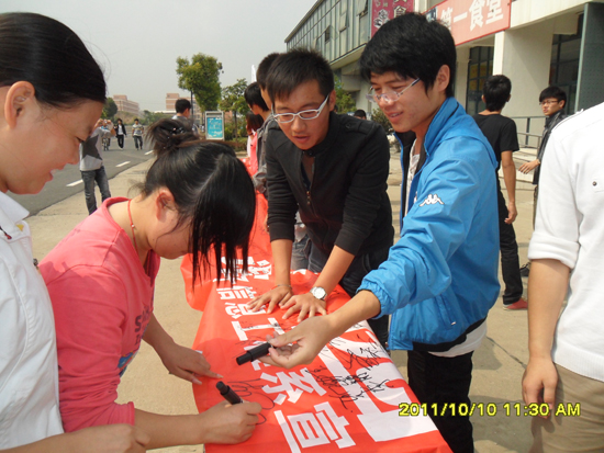 10月10日,辛亥革命100周年紀念日當天,電子信息工程系學(xué)生會在學(xué)院思源堂廣場舉辦了“百年辛亥 和諧校園”簽名活動。同學(xué)們積極響應(yīng),主動簽名,在辛亥革命主題圖片展前駐足,了解革命過程、歷史人物和時代價值。一位張姓同學(xué)鄭重簽下自己的名字后表示:“行動是最好的紀念,發(fā)展是最好的繼承。作為一名大學(xué)生要繼承和弘揚孫中山先生等革命先賢憂國憂民、以振興中華為己任的愛國主義精神;與時俱進、敢為天下先的創(chuàng)新精神,矢志不移、百折不撓的奮斗精神;以及濟世為懷、無私奉獻的博愛精神,好好學(xué)習,努力成才,回報學(xué)校,回報社會,爭做時代先鋒”。