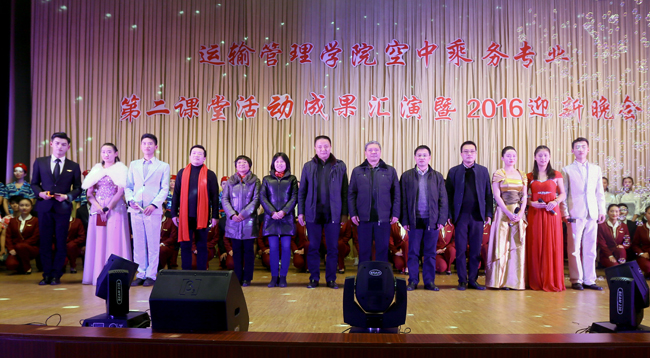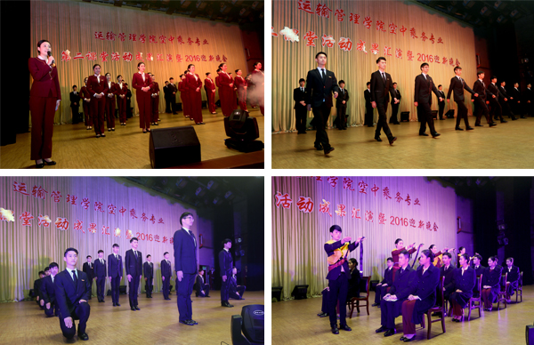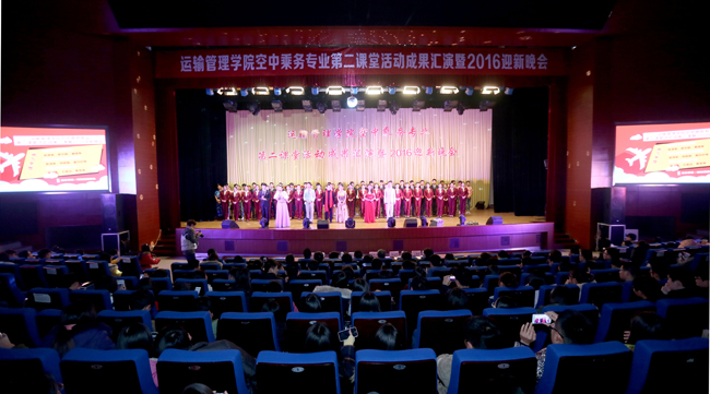 運輸管理學(xué)院空中乘務(wù)專業(yè)第二課堂活動成果匯演暨2016迎新晚會近日在圖書館報告廳舉行。紀(jì)委書記高進(jìn)軍,副院長楊寧、楊益明,運輸管理學(xué)院黨政領(lǐng)導(dǎo),空中乘務(wù)教學(xué)團(tuán)隊全體教師和師生觀眾500多人觀看了演出。