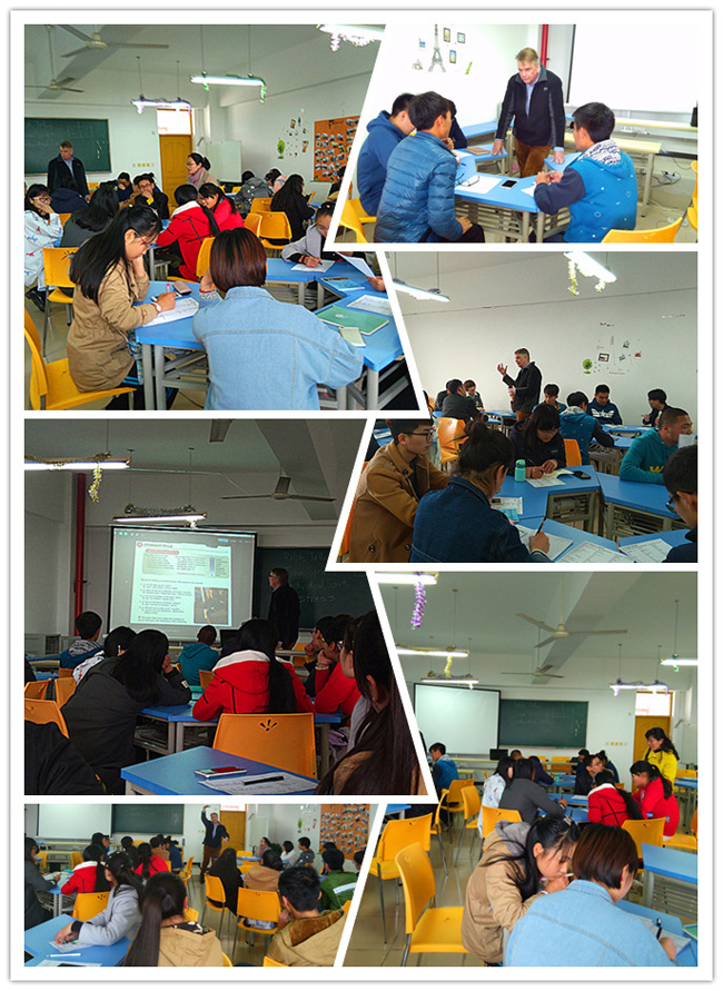 本學(xué)期的英語(yǔ)角由外教Ralph,基礎(chǔ)教學(xué)部滕兆瑋和王芳三位老師共同策劃和主持。本次活動(dòng)的主題是“Sport—Just Do It”。外教Ralph構(gòu)思巧妙,為每位同學(xué)分發(fā)了有關(guān)運(yùn)動(dòng)詞匯和會(huì)話表達(dá)的資料,接著從姚明的籃球生涯談起,利用同學(xué)們熱愛運(yùn)動(dòng)的特點(diǎn),將在場(chǎng)的同學(xué)分成6個(gè)小組,討論各自喜愛的運(yùn)動(dòng)及給我們身心帶來(lái)的好處。同學(xué)們用英語(yǔ)熱烈交流,說(shuō)到興起甚至手舞足蹈,教室里一片歡聲笑語(yǔ)。大家在鍛煉英語(yǔ)口語(yǔ)的同時(shí),也對(duì)運(yùn)動(dòng)產(chǎn)生了濃厚的興趣。