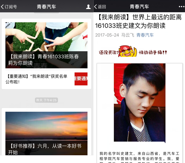 為激發(fā)學(xué)生對(duì)朗讀藝術(shù)的興趣,陶冶學(xué)生的思想情操,營造濃厚的文化氛圍,4月11日起,汽車工程學(xué)院開展了持續(xù)兩個(gè)多月的“聲動(dòng)交院,書香人生——我來朗讀”及每月書單推薦活動(dòng)。