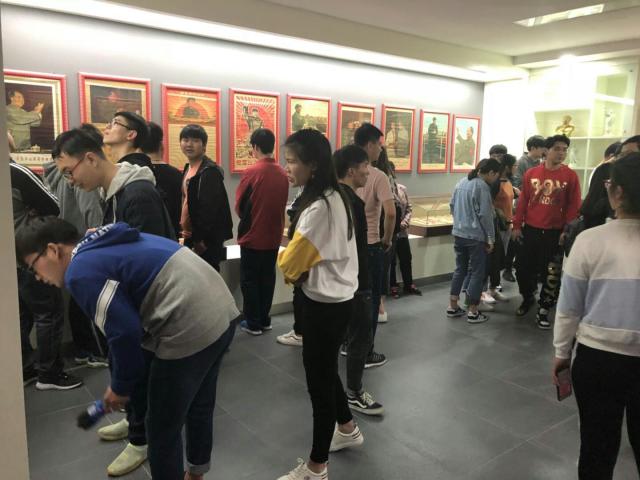 伴隨承館長充滿激情的講解,同學(xué)們依次參觀了紅館4個展廳的珍貴館藏,主要包括毛主席同志和馬、恩、列、斯等歷史偉人及新中國十大元帥、十名大將栩栩如生、惟妙惟肖的瓷版畫像,以新中國成立以來各個主要?dú)v史階段的重大歷史事件為背景的珍貴宣傳畫作,反映老一輩中國共產(chǎn)黨人和革命先烈英勇事跡和獻(xiàn)身精神的塑像、像章、宣傳畫等500余件藏品。