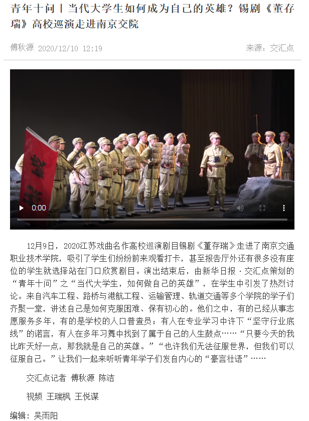 【交匯點】青年十問|當代大學生如何成為自己的英雄?錫劇《董存瑞》高校巡演走進南京交院