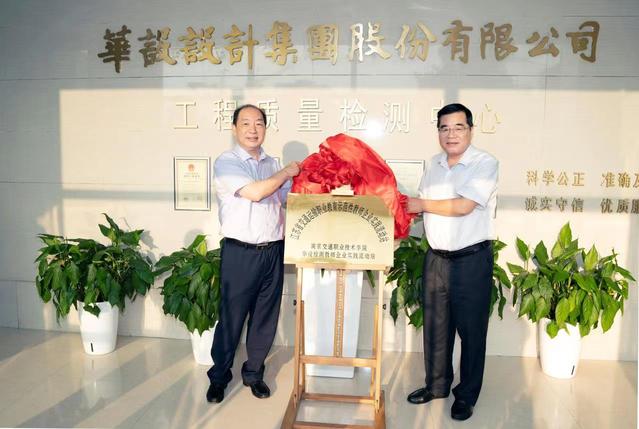 張毅院長、汪春桃副總裁共同為江蘇省交通運輸職業(yè)教育示范性教師企業(yè)實踐流動站 “南京交通職業(yè)技術學院華設檢測教師企業(yè)實踐流動站”揭牌并合影留念。