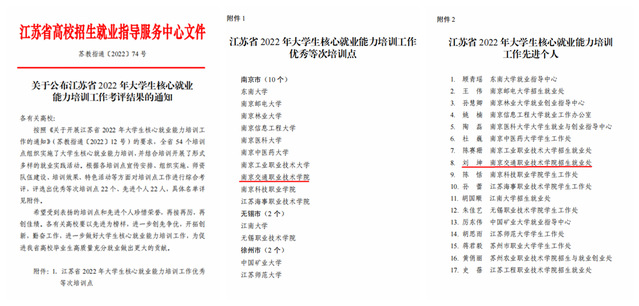 近日,江蘇省高校招生就業(yè)指導(dǎo)服務(wù)中心發(fā)布《關(guān)于公布江蘇省2022年大學(xué)生核心就業(yè)能力培訓(xùn)工作考評(píng)結(jié)果的通知》(蘇教指通〔2022〕74號(hào)),學(xué)院獲評(píng)“江蘇省2022年大學(xué)生核心就業(yè)能力培訓(xùn)工作優(yōu)秀等次培訓(xùn)點(diǎn)”,劉坤老師獲得“江蘇省2022年大學(xué)生核心就業(yè)能力培訓(xùn)工作先進(jìn)個(gè)人”稱(chēng)號(hào)。