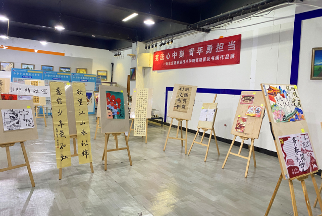 舉辦憲法主題書畫作品展。宣傳周期間,團委舉辦了以“憲法心中刻,青春勇?lián)敗睘橹黝}的憲法普及書畫作品展,同學們以墨寄情、以筆抒意,把學習黨的二十大精神和憲法的心得感悟創(chuàng)作成書畫作品、手工制作等多種藝術展現(xiàn)形式,共征集到全院學生作品170余件,并遴選出優(yōu)秀作品40余件參展。