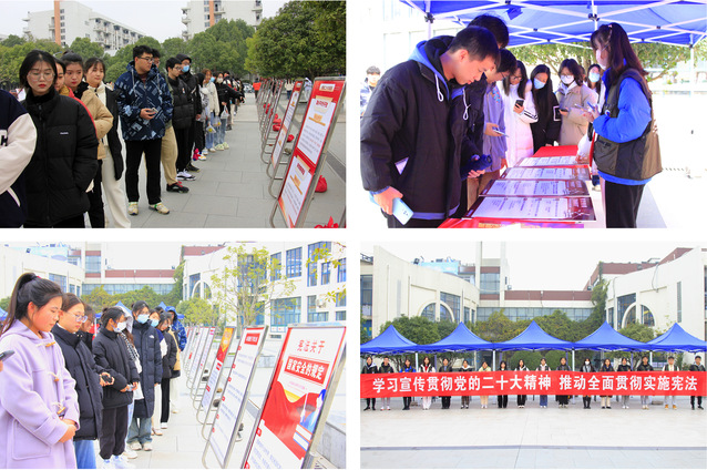 “國家憲法日”線上線下宣傳教育活動。12月4日是第九個國家憲法日,也是我國現(xiàn)行憲法公布施行四十周年。12月3日,學院在思源堂東廣場以互動答題和普法展覽等形式開展了憲法主題宣傳教育活動?,F(xiàn)場,校新媒體中心的普法志愿者們引導大家參與法律知識問答;600多名同學在寒風中有序排隊參與了答題,并在黨的二十大和普法專題展板前駐足觀看。學院還充分利用顯示屏、展板、條幅、宣傳欄以及網站、微信、微博等媒體平臺,線上線下相結合開展“憲法宣傳周”活動標語、海報、視頻展播,在做好宣傳教育同時營造濃厚法治氛圍,推進憲法入腦入心。