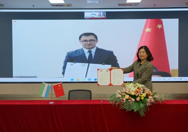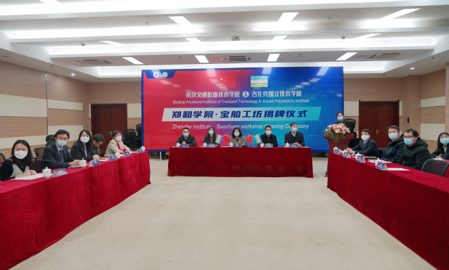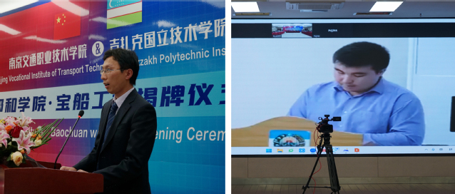 12月16日下午,南京交通職業(yè)技術(shù)學(xué)院—吉扎克國立技術(shù)學(xué)院鄭和學(xué)院·寶船工坊揭牌及開班儀式在圖書館B203隆重舉行。南京交通職業(yè)技術(shù)學(xué)院黨委書記賈俐俐、黨委副書記周傳林;吉扎克國立技術(shù)學(xué)院校長烏斯曼庫洛夫·阿利舍爾、副校長葉加姆納扎洛夫·蓋拉特、別爾季約羅夫·鐵木爾、阿卜杜納扎羅夫·賈姆希德出席儀式;國際合作與交流辦公室、教務(wù)處、發(fā)展規(guī)劃處、汽車工程學(xué)院、路橋與港航工程學(xué)院、運輸管理學(xué)院等相關(guān)部門;吉扎克國立技術(shù)學(xué)院相關(guān)院系分別在南京、烏茲別克斯坦吉扎克以視頻會議的形式參加了云揭幕儀式。