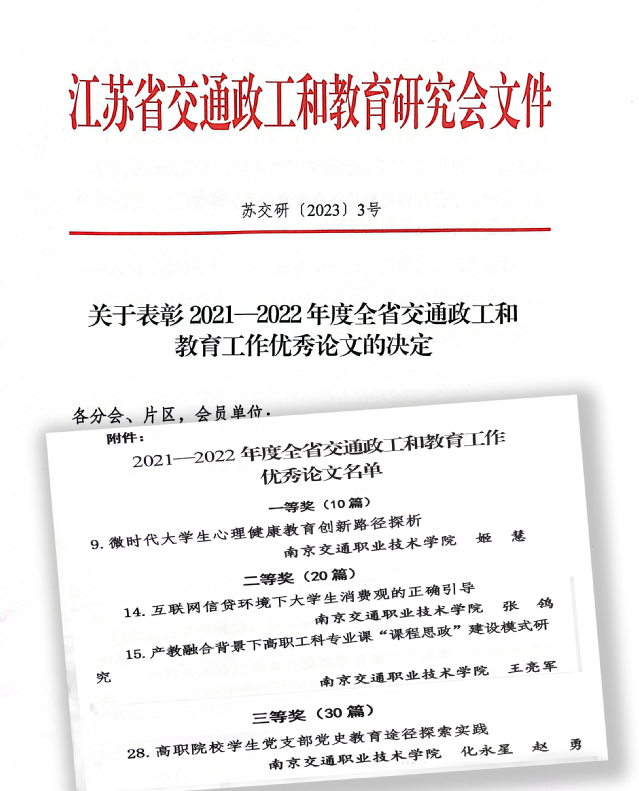 江蘇省交通政工和教育研究會近日公布了《關(guān)于表彰2021—2022年度全省交通政工和教育工作優(yōu)秀論文的決定》(蘇交研【2023】3號),學(xué)院教師參評論文獲一等獎1個、二等獎2個、三等獎1個,其中,《微時代大學(xué)生心理健康教育創(chuàng)新路徑探析》(姬慧)獲一等獎,《互聯(lián)網(wǎng)信貸環(huán)境下大學(xué)生消費觀的正確引導(dǎo)》(張鸰)、《產(chǎn)教融合背景下高職工科專業(yè)課“課程思政”建設(shè)模式研究》(王亮軍)獲二等獎,《高職院校學(xué)生黨支部黨史教育途徑探索實踐》(化永星 趙勇)獲三等獎。