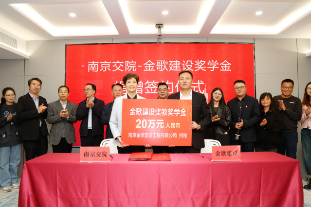 雙方圍繞企業(yè)發(fā)展、人才需求、校企合作等方面進(jìn)行了深入探討,舉行了“南京交院—金歌建設(shè)獎(jiǎng)學(xué)金”捐贈(zèng)儀式和“南京交院金歌建設(shè)校外實(shí)習(xí)基地、教師企業(yè)實(shí)踐基地”掛牌儀式。