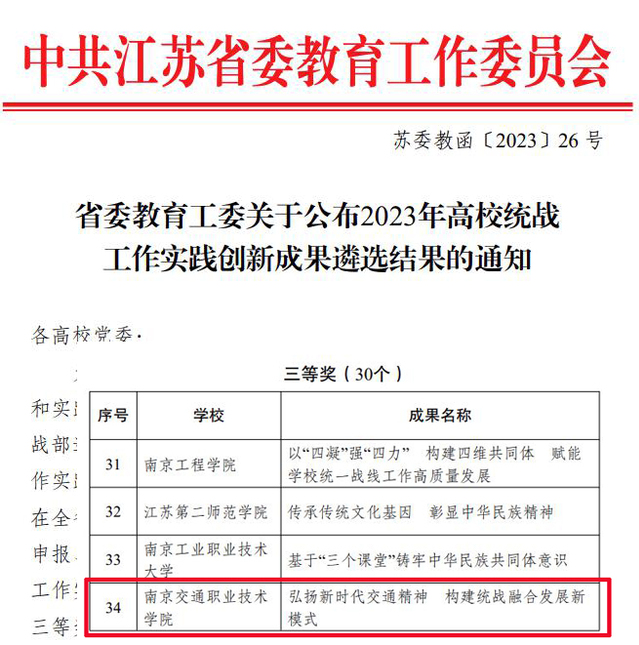 近日,省委教育工委公布了2023年高校統(tǒng)戰(zhàn)工作實(shí)踐創(chuàng)新成果遴選結(jié)果,學(xué)院報送的《弘揚(yáng)新時代交通精神 構(gòu)建統(tǒng)戰(zhàn)融合發(fā)展新模式》榮獲三等獎。
