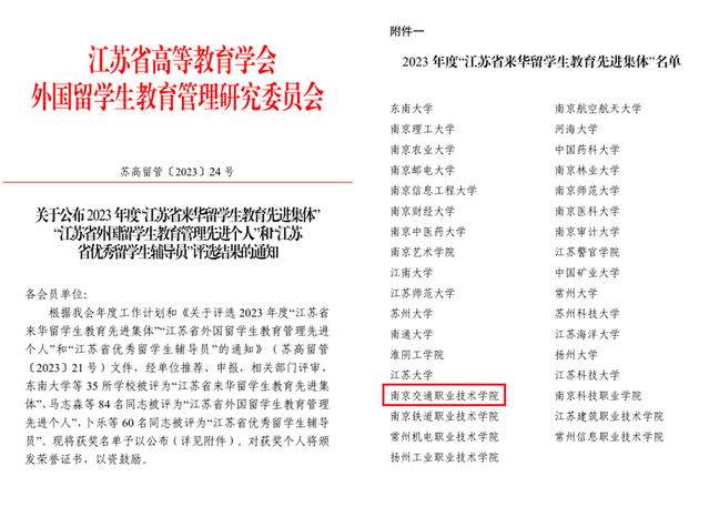 本次江蘇省來(lái)華留學(xué)生先進(jìn)集體評(píng)選活動(dòng)經(jīng)單位申報(bào)、組織推薦、專家綜合評(píng)審等環(huán)節(jié),共評(píng)出“江蘇省來(lái)華留學(xué)生教育先進(jìn)集體”35所,高職院校僅7所,這也是我校繼2022年后再次獲評(píng)“江蘇省來(lái)華留學(xué)生教育先進(jìn)集體”稱號(hào)。