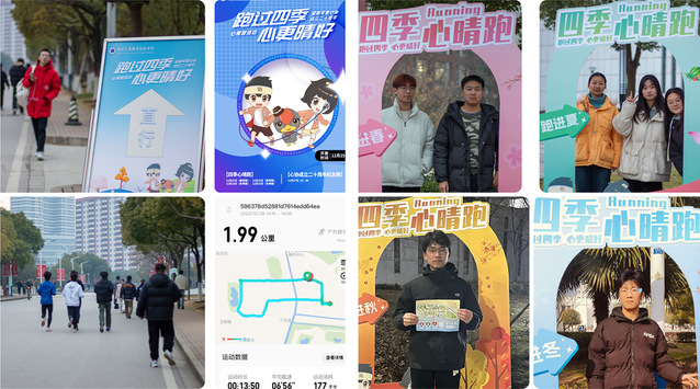 參加四季心晴跑運動打卡的學生連續(xù)四天從K棟宿舍的一站式綜合服務(wù)大廳出發(fā),用有關(guān)運動的軟件記錄心晴跑的軌跡,并在當天指定的地點,打卡拍攝呈現(xiàn)四季主題特色的照片或視頻。正值新的一年即將到來之際,同學們在奔跑中釋放壓力,在回顧四季變遷中體會成長,在完成打卡任務(wù)中感受陪伴和運動的快樂。