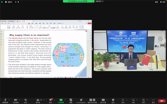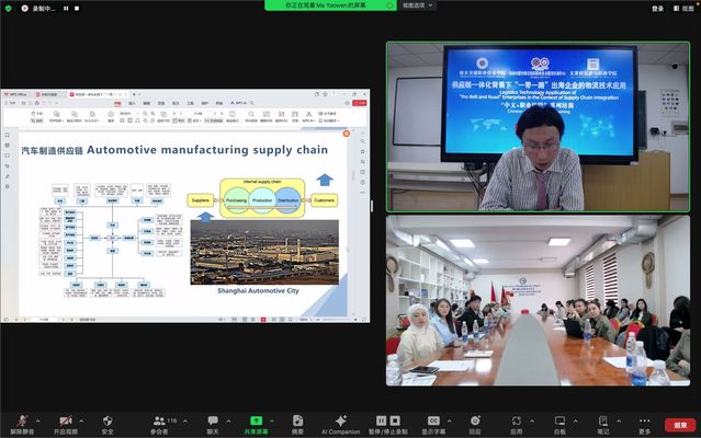 運(yùn)輸管理學(xué)院馬耀文老師系統(tǒng)介紹了“一帶一路”背景下供應(yīng)鏈一體化創(chuàng)新、冷鏈物流技術(shù)在中國(guó)出海企業(yè)的應(yīng)用以及產(chǎn)教融合對(duì)中國(guó)企業(yè)物流技術(shù)應(yīng)用的推動(dòng)。相關(guān)專業(yè)知識(shí)還有針對(duì)性地設(shè)計(jì)了線上技能訓(xùn)練和互動(dòng)。培訓(xùn)內(nèi)容專業(yè)性高、實(shí)用性強(qiáng),學(xué)生們反響熱烈。在互動(dòng)答疑環(huán)節(jié),馬老師還就“推動(dòng)新質(zhì)生產(chǎn)力發(fā)展,與一帶一路國(guó)家生產(chǎn)企業(yè)共同創(chuàng)新打造一體化供應(yīng)鏈”與學(xué)生們開展了深刻的交流探討,學(xué)生們踴躍提問(wèn),現(xiàn)場(chǎng)氣氛活躍。