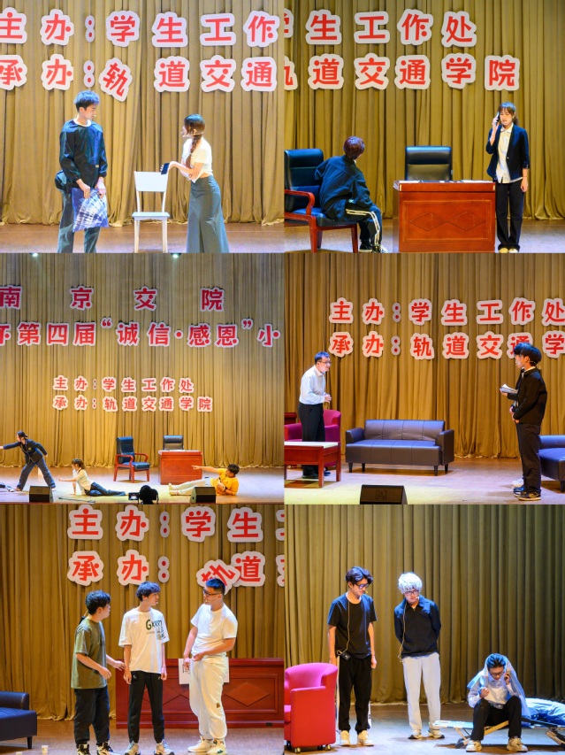 同學(xué)們圍繞“誠信·感恩”主題,自主策劃,自導(dǎo)自演將生活中的點(diǎn)滴細(xì)節(jié)融入到作品當(dāng)中,從幽默溫暖的生活瑣事到引人共鳴的社會熱點(diǎn),傳遞了積極向上的價值觀,整場比賽掌聲不斷,感人的劇情,精彩的表演,贏得了現(xiàn)場評委和觀眾的高度贊揚(yáng)。經(jīng)過激烈角逐,建筑工程學(xué)院作品《走過場》獲一等獎;軌道交通學(xué)院作品《坑》、路橋與港航工程學(xué)院作品《天網(wǎng)恢恢》獲二等獎;運(yùn)輸管理學(xué)院作品《錢去哪兒了》、人文藝術(shù)系作品《真的假不了 假的跑不掉》、電子信息工程學(xué)院作品《一個女婿半個兒》、汽車工程學(xué)院作品《還不還》獲三等獎。