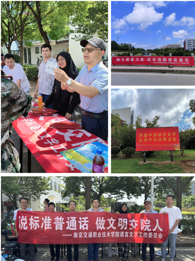 虛實結(jié)合、動靜結(jié)合,突出推普文化宣傳?;顒悠陂g,學(xué)院各類網(wǎng)絡(luò)媒體、電子媒介都集中推出宣傳,學(xué)院西大門電子大屏滾動播放“加大推普力度,筑牢強國語言基石”,動員全院師生勇?lián)厝?、積極作為;校園各主干道懸掛了特色鮮明的宣傳橫幅,倡導(dǎo)全院師生“說標(biāo)準(zhǔn)普通話,做文明交院人”“熱愛中國語言文字,傳承優(yōu)秀傳統(tǒng)文化”。青年學(xué)子熱情參與,走出教室、走出宿舍、走出校園,在校園內(nèi)向廣大師生以及在地鐵1號線南京交院站向過往乘客分發(fā)宣傳單頁,熱情推普,較好地展現(xiàn)了交院學(xué)子融入時代發(fā)展洪流、勇膺文化傳承使命的青春風(fēng)采。