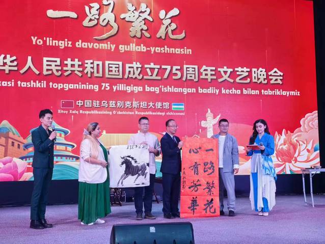 整場(chǎng)晚會(huì)不僅是對(duì)祖國(guó)華誕的熱烈慶祝,更是對(duì)家國(guó)情懷的深情表達(dá)。三位老師不辭辛苦,萬(wàn)里奔波,反復(fù)排練,帶著對(duì)祖國(guó)的深厚感情和為中烏友誼添磚加瓦的良好祝愿,用畫(huà)筆、琴聲盡情抒發(fā)熾熱情感。兩位老師的現(xiàn)場(chǎng)藝術(shù)作品打動(dòng)了現(xiàn)場(chǎng)觀(guān)眾,作品被塔什干孔子學(xué)院收藏。三位老師的音書(shū)畫(huà)現(xiàn)場(chǎng)創(chuàng)作既是一次國(guó)際文化交流,也展示了中國(guó)的傳統(tǒng)文化魅力。