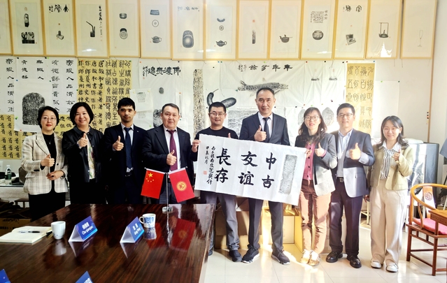 來訪嘉賓們實地參觀了學(xué)校路橋國家級虛擬仿真實訓(xùn)中心、軌道交通學(xué)院和人文藝術(shù)系的校內(nèi)實訓(xùn)基地。阿茲莫夫·貝克圖爾院長還親自嘗試了非遺拓印,中吉老師共同創(chuàng)作了一幅書畫作品。奧什國立大學(xué)代表團(tuán)對學(xué)院校園環(huán)境、實訓(xùn)室建設(shè)和文化傳承技藝給予了高度評價,并對兩校未來進(jìn)一步深化合作表達(dá)了期待。