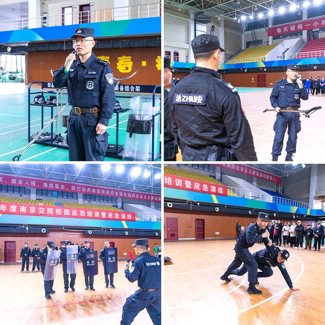為了有效防范和應(yīng)對(duì)校園突發(fā)暴恐事件,提升師生員工自我防御和應(yīng)急處置能力,12月4日上午,保衛(wèi)處邀請(qǐng)了南京市公安局特警支隊(duì)韋濤中隊(duì)長一行五人來校開展了反恐防暴應(yīng)急處置培訓(xùn)演練,全體保安,學(xué)工、后勤、資產(chǎn)、學(xué)生及外包服務(wù)人員代表等近200人參加了培訓(xùn),學(xué)院副院長姜軍全程觀摩本次活動(dòng)。