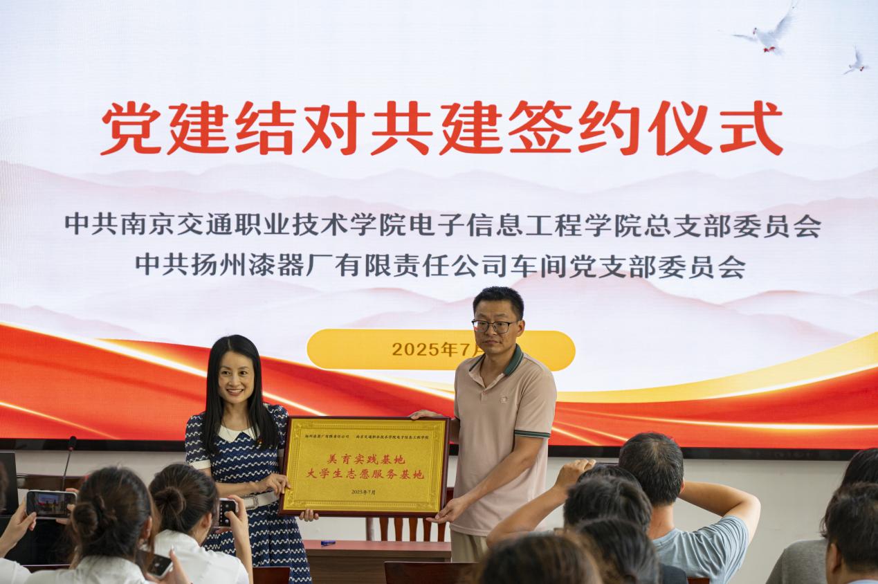 為深化校企協(xié)同,探索優(yōu)勢(shì)互補(bǔ)的發(fā)展機(jī)制,推動(dòng)非遺文化傳承與企業(yè)服務(wù)融合,7月7日上午,南京交通職業(yè)技術(shù)學(xué)院電子信息工程學(xué)院與揚(yáng)州漆器廠舉行黨建共建簽約暨“美育實(shí)踐基地”掛牌儀式。揚(yáng)州漆器廠車(chē)間黨支部書(shū)記韓鋒、學(xué)院黨總支副書(shū)記吳蓉蓉、輔導(dǎo)員葛漢卿、企業(yè)黨員代表以及“數(shù)智童傳,漆藝新生——以青春科技助力非遺傳承實(shí)踐團(tuán)”全體成員出席活動(dòng)。