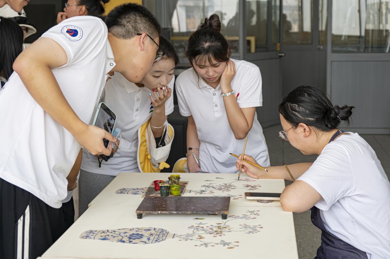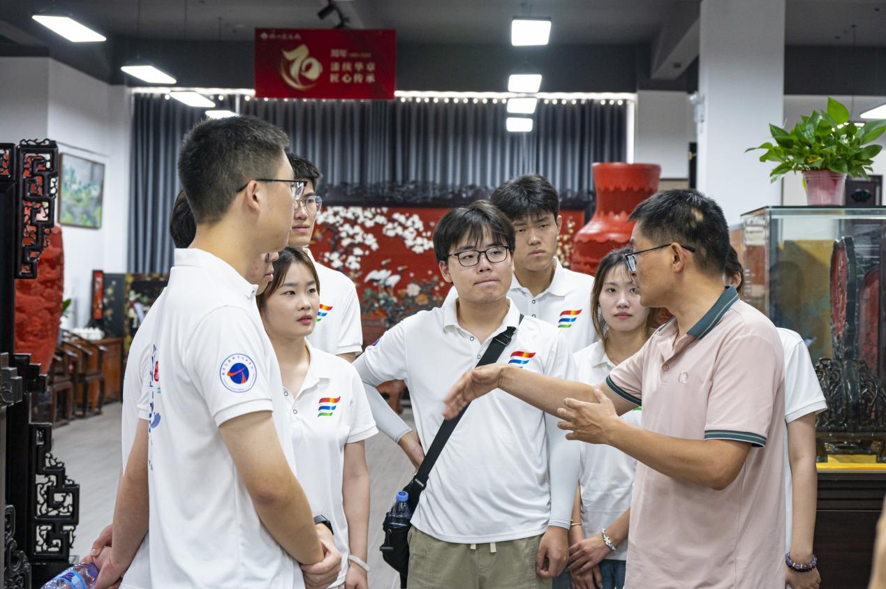 掛牌儀式后,實(shí)踐團(tuán)成員在黨員工匠的帶領(lǐng)下開(kāi)啟沉浸式研學(xué)之旅。參觀環(huán)節(jié)中,同學(xué)們走進(jìn)漆器制作車(chē)間,近距離觀摩選料、制胎、髹漆、裝飾等傳統(tǒng)工序。黨員工匠現(xiàn)場(chǎng)演示了螺鈿鑲嵌、點(diǎn)螺等非遺技藝,行云流水般的操作展現(xiàn)出深厚功力。原本普通的材料在匠人手中煥發(fā)出獨(dú)特光澤,引得現(xiàn)場(chǎng)贊嘆連連,紛紛用鏡頭記錄精彩瞬間。