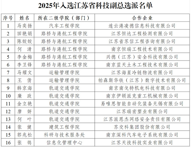 近日,江蘇省委人才辦、江蘇省科技廳公布了2025年江蘇省科技副總選派名單(蘇科區(qū)成發(fā)〔2025〕172號),學(xué)院共有16名教師入選,入選人數(shù)名列全省高職院校前列。