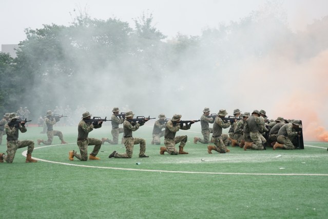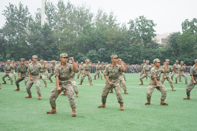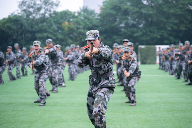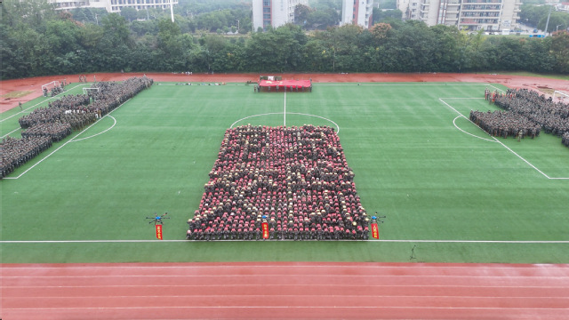 21個(gè)徒手方隊(duì)在以軍訓(xùn)團(tuán)旗為首的戰(zhàn)旗方隊(duì)引領(lǐng)下,伴著莊重威嚴(yán)的分列式進(jìn)行曲闊步入場(chǎng),接受檢閱,獵獵戰(zhàn)旗昭示不朽軍魂,鏗鏘步伐踏出時(shí)代強(qiáng)音。匯報(bào)表演環(huán)節(jié),擺字方陣、男生刺殺操、女生旗語(yǔ)表演、教官軍體拳、戰(zhàn)場(chǎng)綜合演練依次亮相,槍刺閃閃,目光凜凜,硝煙燃起,舍我其誰(shuí)。當(dāng)無(wú)人機(jī)承載著正義必勝、和平必勝、人民必勝的字幅駛?cè)胗?xùn)練場(chǎng),現(xiàn)場(chǎng)掌聲雷動(dòng),久久不散,深刻詮釋了交院學(xué)子鐵一般的信仰、鐵一般的信念、鐵一般的紀(jì)律與鐵一般的擔(dān)當(dāng)。