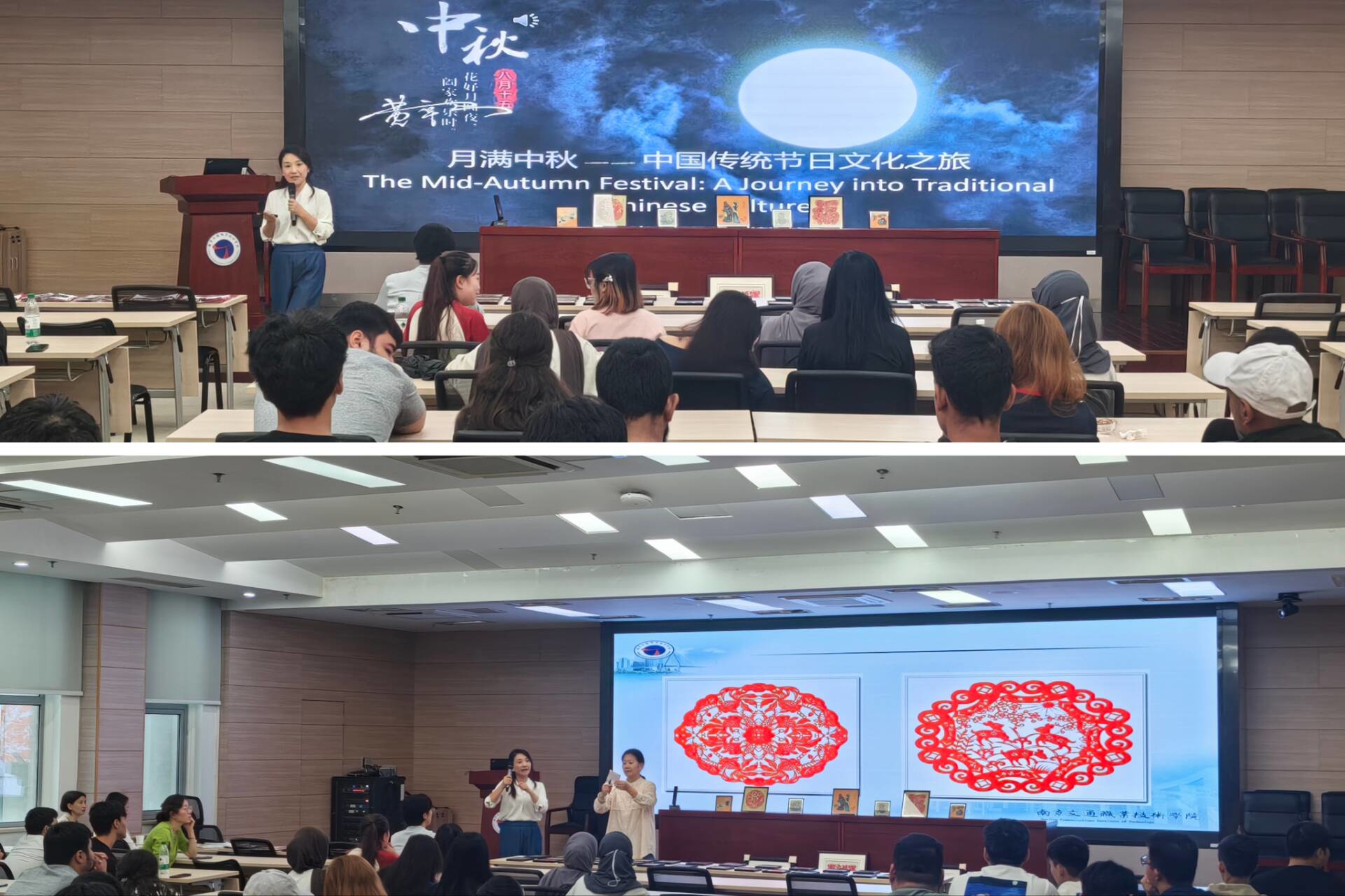 9月29日下午,國際教育學院精心策劃并組織全體在校留學生開展了“中秋文化知多少”主題活動暨剪紙藝術(shù)體驗課,講座和體驗活動由南京剪紙非遺傳承人應家玲老師、留學生班主任基礎(chǔ)教學部袁夕娣老師聯(lián)袂開展,留學生班主任、第二班主任、全體留學生參加活動。活動由國際教育學院副院長扈凝主持。