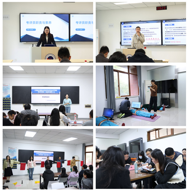 實操培訓(xùn)階段,教研室金立艷老師系統(tǒng)講解“考評員職責(zé)與素養(yǎng)”,強(qiáng)調(diào)公平公正與嚴(yán)謹(jǐn)規(guī)范,結(jié)合案例剖析考評標(biāo)準(zhǔn);王亮軍老師圍繞“考評員工作要點”,從考試流程、評分要點到應(yīng)急處置多維度展開,深化理解。隨后,陶雨濛、石玉香老師組織手信號、心肺復(fù)蘇項目實訓(xùn)練習(xí),強(qiáng)化學(xué)員對評分標(biāo)準(zhǔn)與關(guān)鍵觀測點的把握能力。最后通過模擬考評,高度還原考評現(xiàn)場,有效提升參訓(xùn)教師在考評過程中的規(guī)范性與應(yīng)變能力。