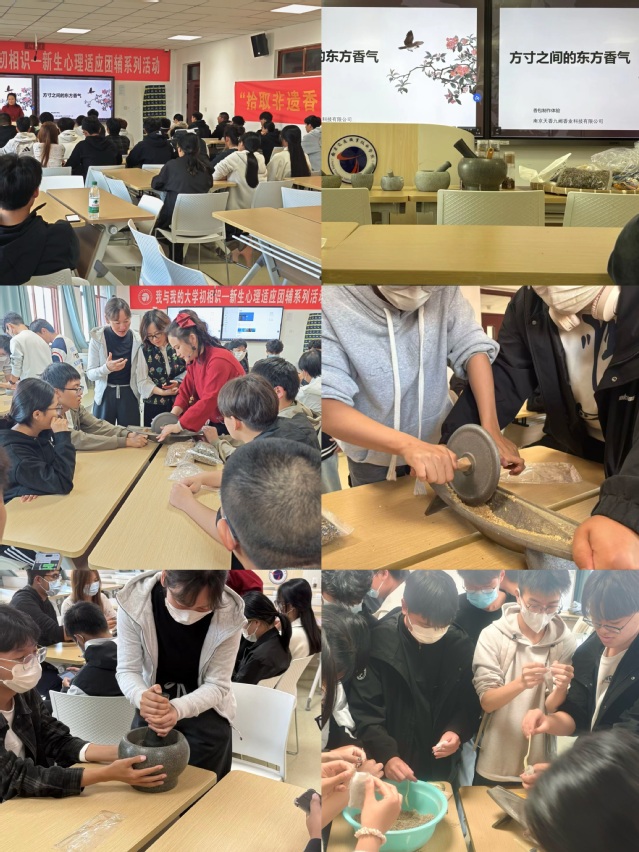 活動(dòng)在淡雅藥香中拉開帷幕。首先,一場生動(dòng)的香囊文化講堂為同學(xué)們梳理了香囊的歷史源流與養(yǎng)生智慧。隨后的手作體驗(yàn)環(huán)節(jié)將氣氛推向高潮,同學(xué)們興致盎然地選取布料、香材,親手操作青石碾、石臼等傳統(tǒng)工具,將丁香、佛手柑、黃芩、川芎、紫蘇等十余味中藥材細(xì)心研磨、配伍、填充?,F(xiàn)場藥香馥郁,笑語盈盈。制作完成后,一件件獨(dú)具匠心的作品被集中展示,方寸香囊寄托著同學(xué)們的美好祈愿。活動(dòng)尾聲,全體參與者手持作品合影留念,記錄下這溫馨而富有意義的瞬間。