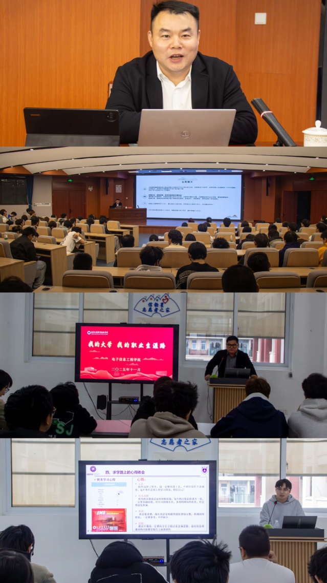 座談會(huì)后, 2002級(jí)校友劉新成、2007級(jí)校友薛松、2017級(jí)校友黃文健面向?qū)W院200余名學(xué)生開(kāi)展了“我的大學(xué)·我的職業(yè)生涯路”校友訪談報(bào)告。他們分享了在校期間的學(xué)習(xí)經(jīng)驗(yàn)和創(chuàng)業(yè)歷程中的挑戰(zhàn)與突破。