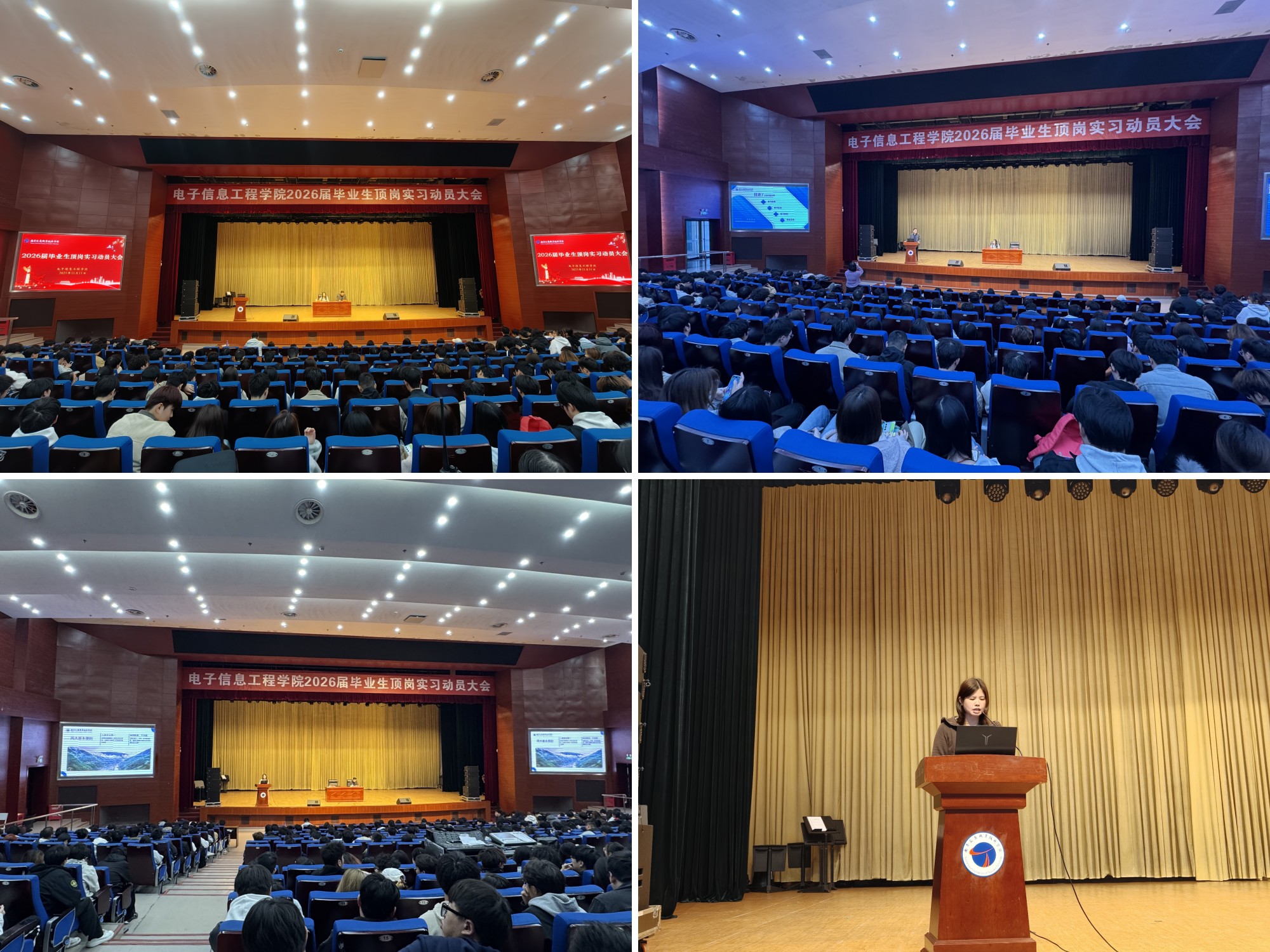 為進(jìn)一步加強(qiáng)頂崗實習(xí)期間的教學(xué)和學(xué)生管理工作,11月11日下午,電子信息工程學(xué)院于圖書館報告廳召開了2026屆畢業(yè)生頂崗實習(xí)動員大會。電子信息工程學(xué)院相關(guān)老師、2023級輔導(dǎo)員及全體學(xué)生參加了大會,會議由學(xué)院黨總支副書記吳蓉蓉主持。