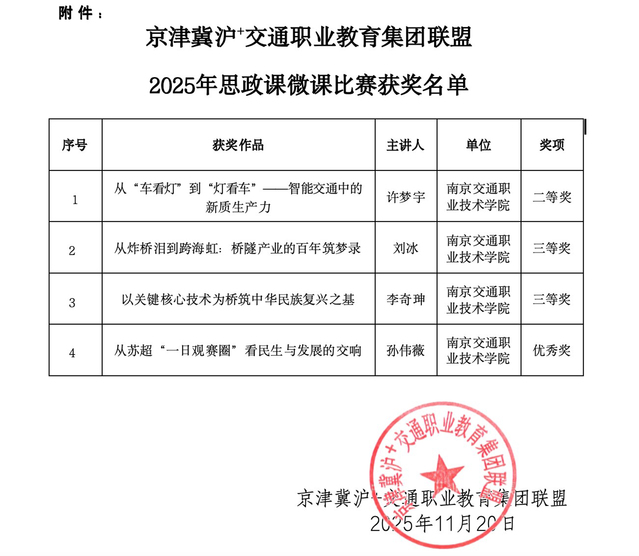近日,京津冀滬+交通職業(yè)教育集團(tuán)聯(lián)盟正式公布2025年思政微課比賽獲獎(jiǎng)名單,我院選送的4件作品表現(xiàn)優(yōu)異,榮登榜單。其中,許夢(mèng)宇老師榮獲二等獎(jiǎng),劉冰老師、李奇珅老師分獲三等獎(jiǎng),孫偉薇老師獲得優(yōu)秀獎(jiǎng)。