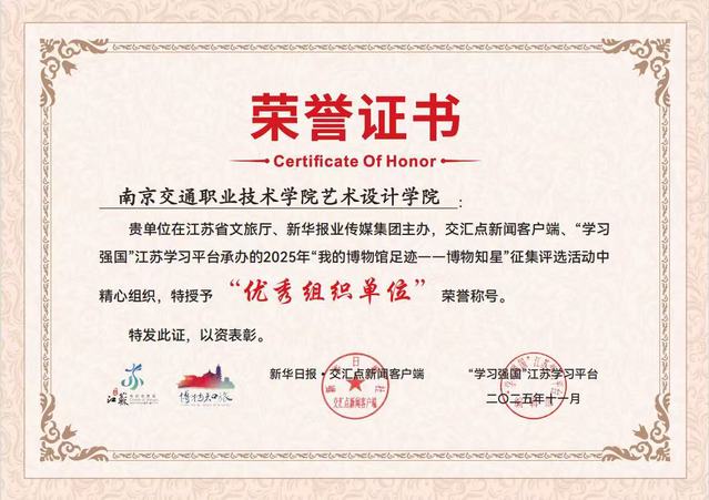近日,在由江蘇省文化和旅游廳、新華報業(yè)傳媒集團(tuán)聯(lián)合主辦,交匯點(diǎn)新聞客戶端、“學(xué)習(xí)強(qiáng)國”江蘇學(xué)習(xí)平臺具體承辦的2025年“我的博物館足跡——博物知星”征集評選活動中,藝術(shù)設(shè)計(jì)學(xué)院憑借精心組織與深度參與,被授予“優(yōu)秀組織單位”榮譽(yù)稱號。