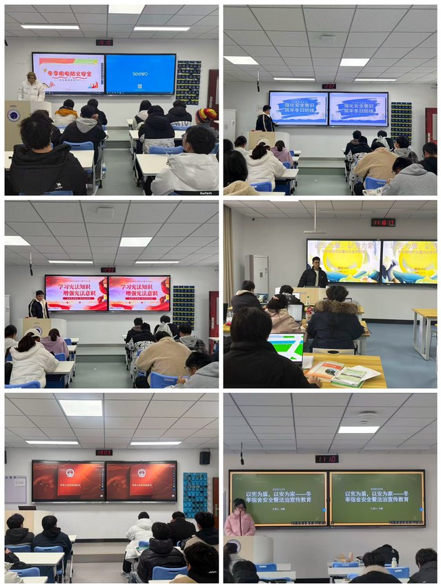 班會(huì)圍繞“憲法守護(hù)權(quán)利,安全守護(hù)家園”主線展開。各班級(jí)通過觀看教育部“憲法晨讀”視頻、集體誦讀憲法條文、學(xué)習(xí)《中華人民共和國憲法》中關(guān)于公民基本權(quán)利與義務(wù)等內(nèi)容,引導(dǎo)學(xué)生深刻理解憲法作為國家根本法的權(quán)威地位,感悟“憲法就在身邊”。同時(shí),結(jié)合真實(shí)案例,班會(huì)重點(diǎn)講解冬季宿舍防火、防詐、安全用電、防盜等注意事項(xiàng),強(qiáng)調(diào)嚴(yán)禁使用違規(guī)電器、私拉亂接電線等行為,并普及《中華人民共和國消防法》《中華人民共和國治安管理處罰法》等相關(guān)法律法規(guī),幫助同學(xué)們樹立“安全無小事、守法是責(zé)任”的理念。