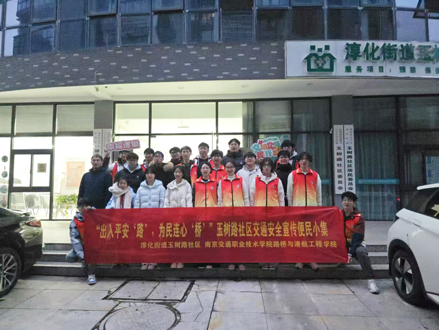 12月24日下午,路橋與港航工程學(xué)院聯(lián)合江寧區(qū)淳化街道玉樹路社區(qū),在社區(qū)黨群服務(wù)中心及小區(qū)出入口成功舉辦主題為“出入平安‘路’,為民連心‘橋’”的交通安全宣傳便民活動。輔導(dǎo)員吳連合帶領(lǐng)10余名學(xué)生志愿者參與,旨在結(jié)合專業(yè)特色提升居民安全意識,深化學(xué)生實踐能力。