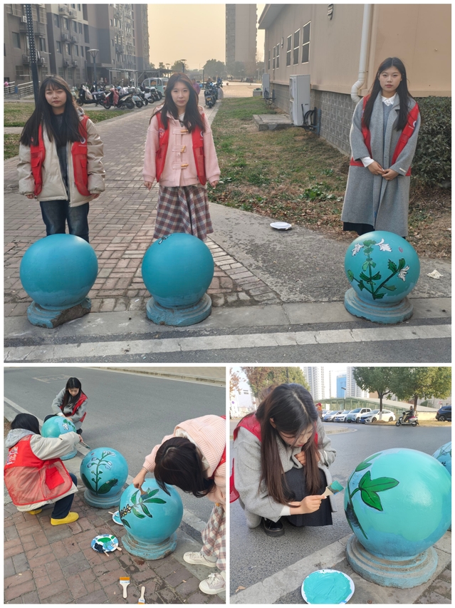 隊員們充分發(fā)揮環(huán)境設(shè)計與美術(shù)功底,結(jié)合園林藝術(shù)專業(yè)知識,對社區(qū)原本單調(diào)的石墩進(jìn)行設(shè)計改造。從清潔打磨、勾勒底稿到調(diào)色上漆,將冰冷石墩變?yōu)槌休d文化與趣味的“藝術(shù)品”,顯著提升了社區(qū)的視覺美感與活力。師生們嚴(yán)謹(jǐn)細(xì)致的專業(yè)態(tài)度與充滿創(chuàng)意的設(shè)計,贏得了社區(qū)工作人員與居民的一致稱贊。