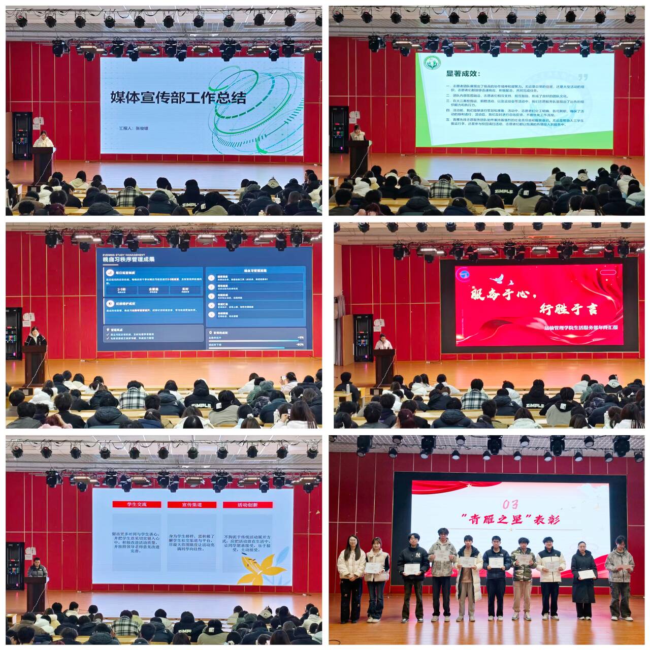 隨后進行的部門風采展示中,各部門借助PPT圖文并茂地介紹了工作職能與團隊文化,現(xiàn)場氣氛熱烈,充分彰顯了學生會的多元活力與青春創(chuàng)意。“青雁之星”表彰環(huán)節(jié)將大會推向高潮。本次大會對工作中表現(xiàn)突出的個人授予“青雁之星”榮譽稱號,并評選出具有高度凝聚力與突出貢獻的“青雁部門”。