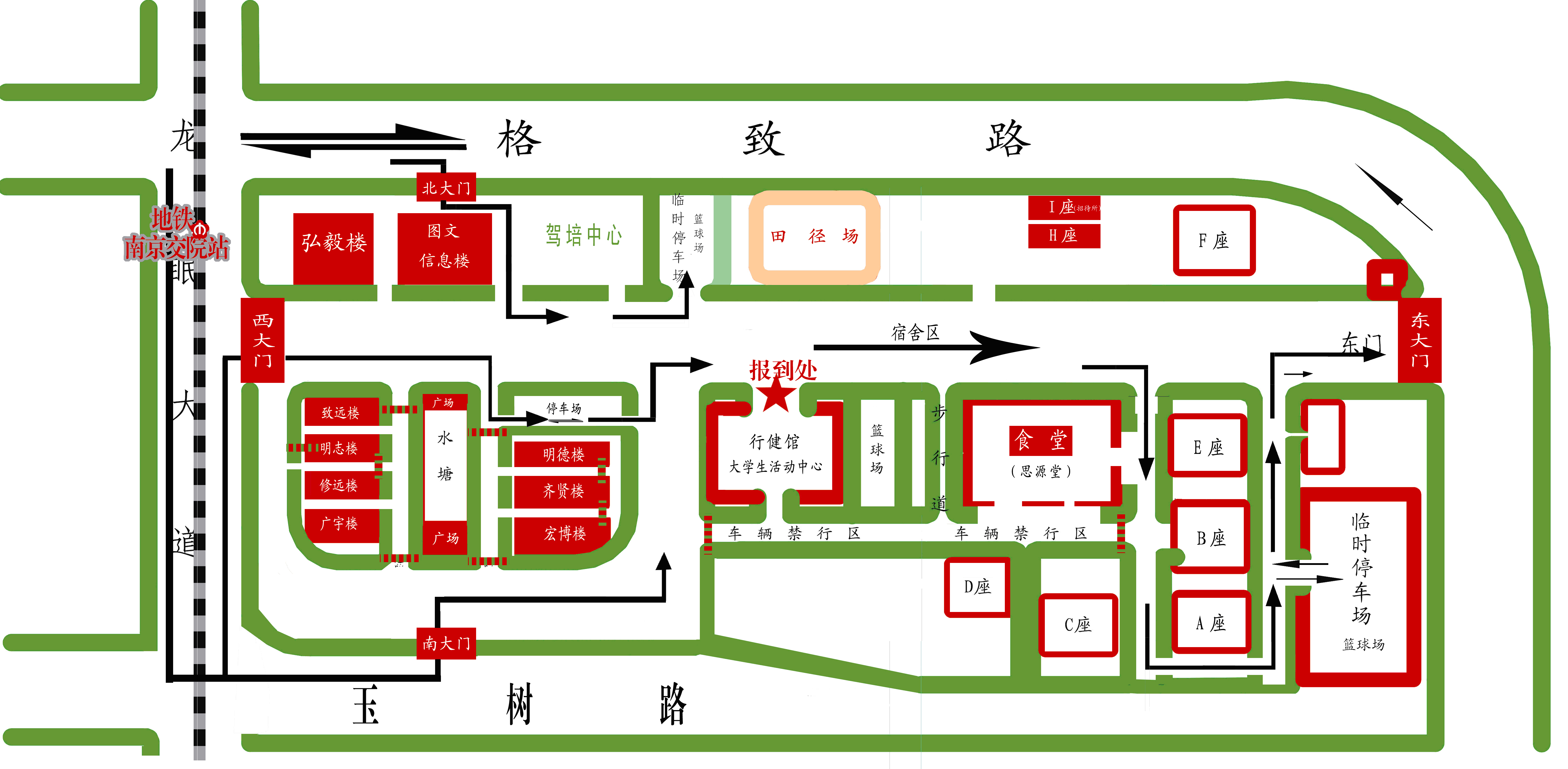 (3)宿舍地點在A B C D E 座的新生在第四食堂東北路口右轉(zhuǎn)按上圖所示沿環(huán)線單向行駛,禁止逆行。