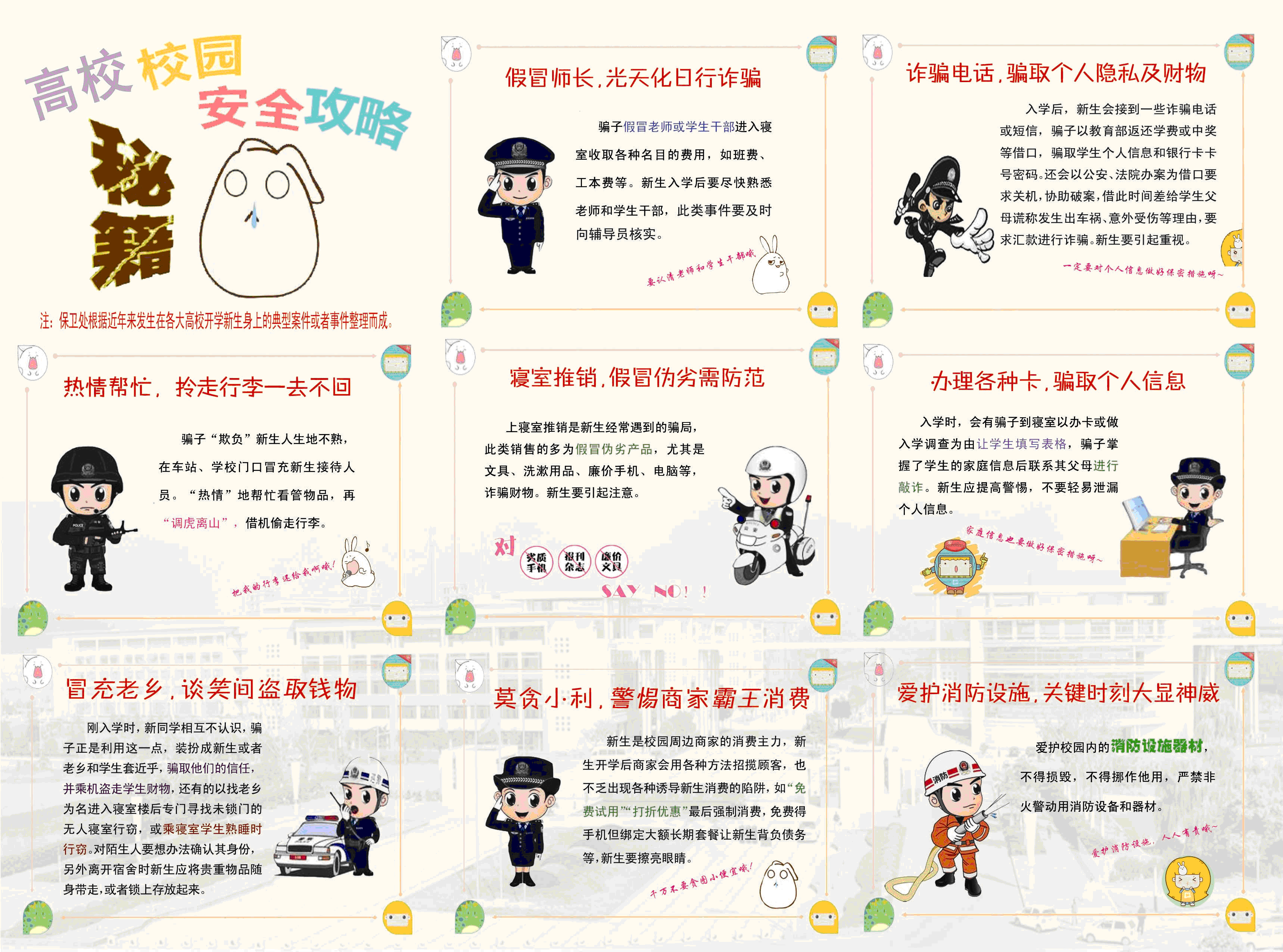 “貴重物品不要放在顯眼的地方;警惕和拒絕任何到宿舍推銷電話卡、上網(wǎng)卡、訂書報的人,交學費務(wù)必自己到學校財務(wù)處收費處繳,錢財不要交給陌生人……”一年一度的迎新工作馬上就要開始了,保衛(wèi)處提醒:大學新生報到期間,各種盜竊和騙局十分常見,要嚴加防范。