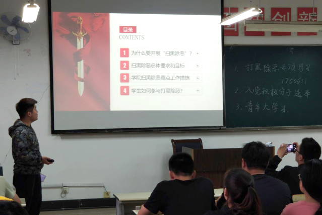 中午,學工辦組織召開了掃黑除惡專項斗爭學生工作布置會,周昊明老師要求各班認真組織學習《掃黑除惡專項斗爭應知應會讀本》,領會掃黑除惡專項斗爭的重要意義。