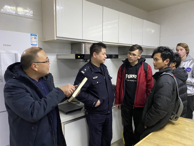 專題講座后,社區(qū)民警周興勇、周家明副處長及國際合作與交流辦公室的留管老師們實地走訪了留學生宿舍,檢查了留學生寢室,并對插座用電安全、食品衛(wèi)生安全、個人物品保管等方面提出了寶貴意見。