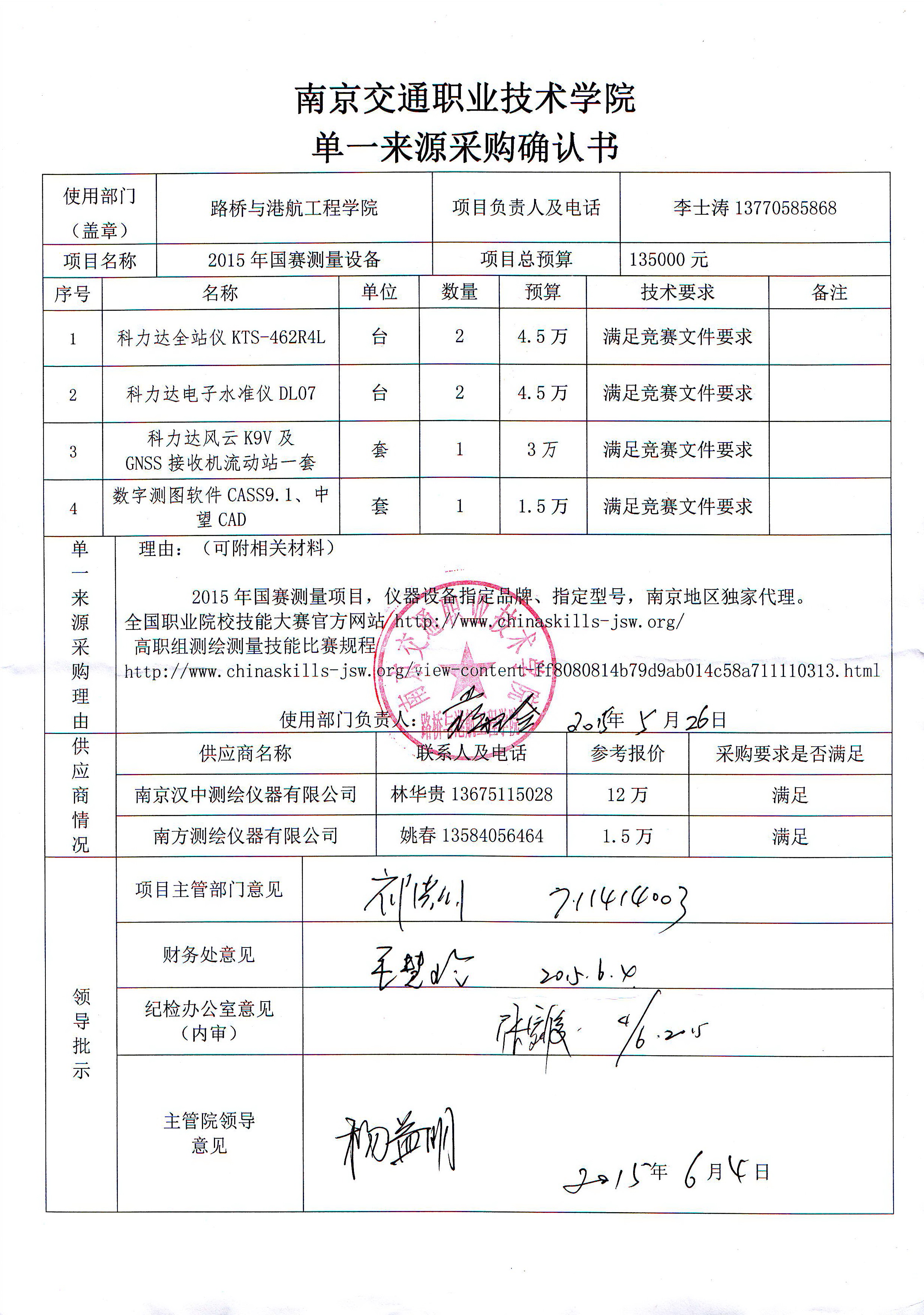 我部門受路橋與港航工程學(xué)院的委托,擬對(duì)該部門委托的采購(gòu)編號(hào)為JY2015069號(hào)2015國(guó)賽測(cè)量設(shè)備采購(gòu)項(xiàng)目實(shí)施院級(jí)采購(gòu)。本部門根據(jù)采購(gòu)人的實(shí)際申報(bào)情況,擬對(duì)該項(xiàng)目采用單一來源采購(gòu)方式。