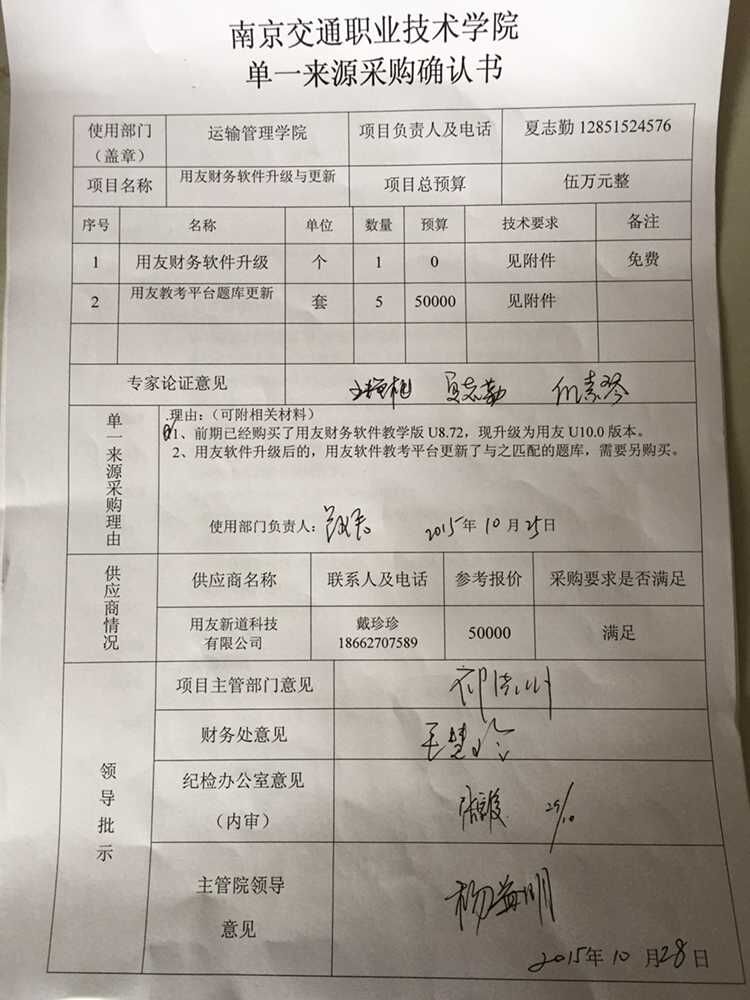 我部門受運輸管理學院的委托,擬對該部門委托的采購編號為JY2015122號用友財務軟件升級與題庫更新項目實施單一來源采購。